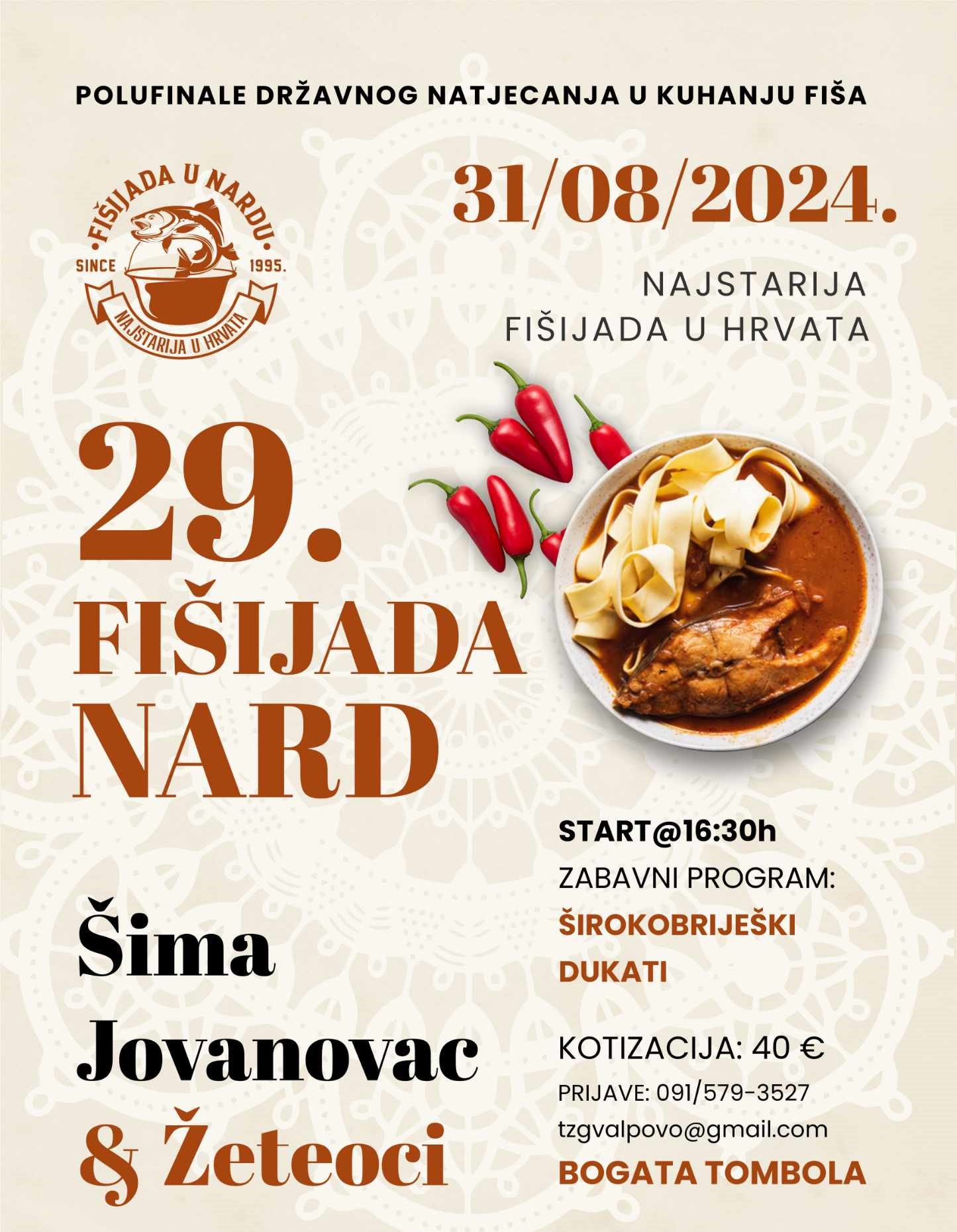 U subotu, 31. kolovoza 2024. godine, TZ Grada Valpova u suradnji s Gradom Valpovom, Turističkom zajednicom Baranje i NK „Drava“ Nard, organizira 29. po redu Fišijadu u Nardu.