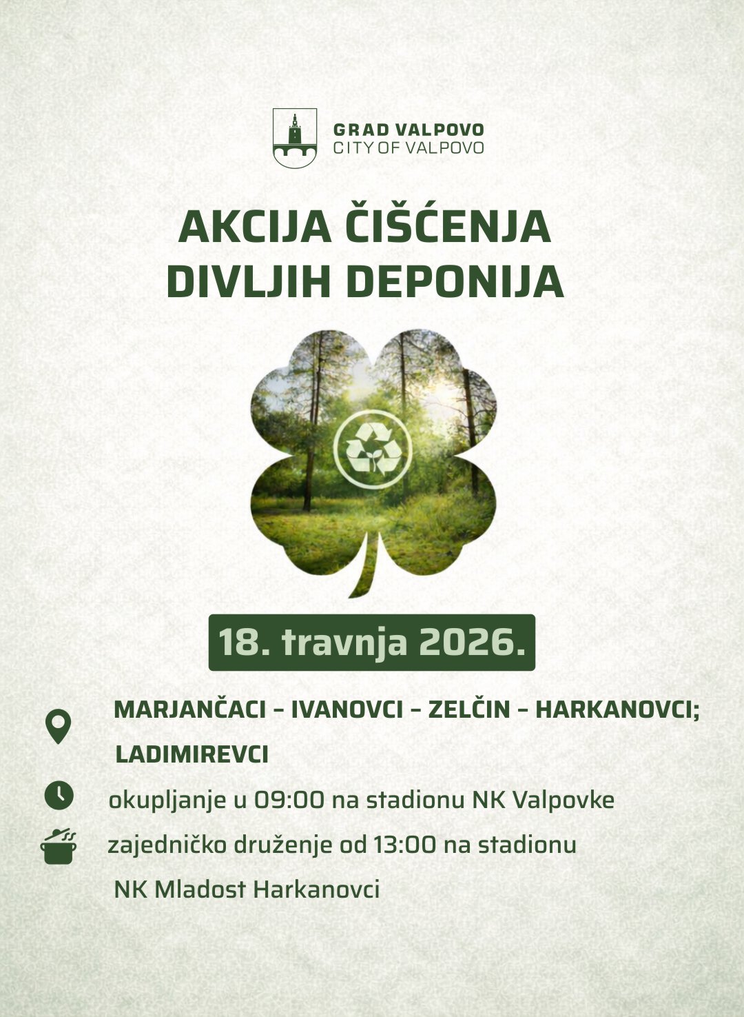 U subotu, 18. travnja 2026. godine, Grad Valpovo organizira akciju čišćenja divljih deponija na području naselja: