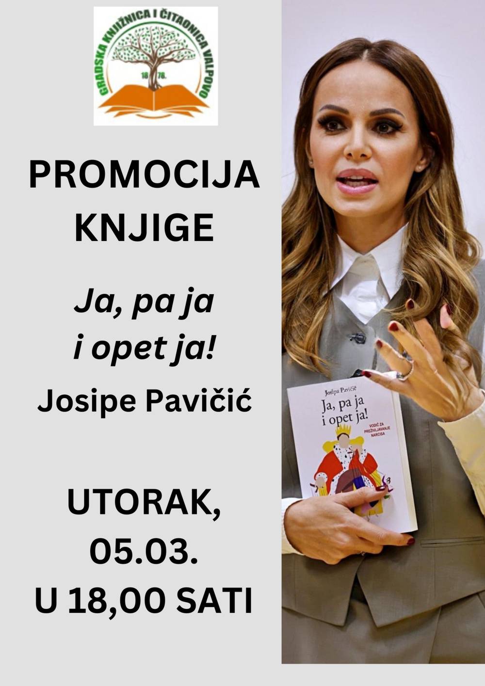 Spisateljica Josipa Pavičić u Valpovu će predstaviti svoj prvi vodič za preživljavanje narcisa, knjigu “Ja, pa ja i opet ja!”. Svi smo na neki smo način pogođeni tom epidemijom i nitko od nas nije imun na njezine učinke. Okruženi smo narcisima i nema pravila ni  obrasca po kojem ih možemo prepoznati na prvi pogled. I zato će ova  knjiga čitateljima biti od velike pomoći. U njoj Josipa Pavičić pomno proučava narcisoidnu osobnost, taj neizlječiv i često za okolinu razoran poremećaj s kojim se danas sve češće susrećemo u svim životnim područjima: od obiteljskog i prijateljskog okruženja preko poslovnog i javnog pa sve do romantičnih odnosa.