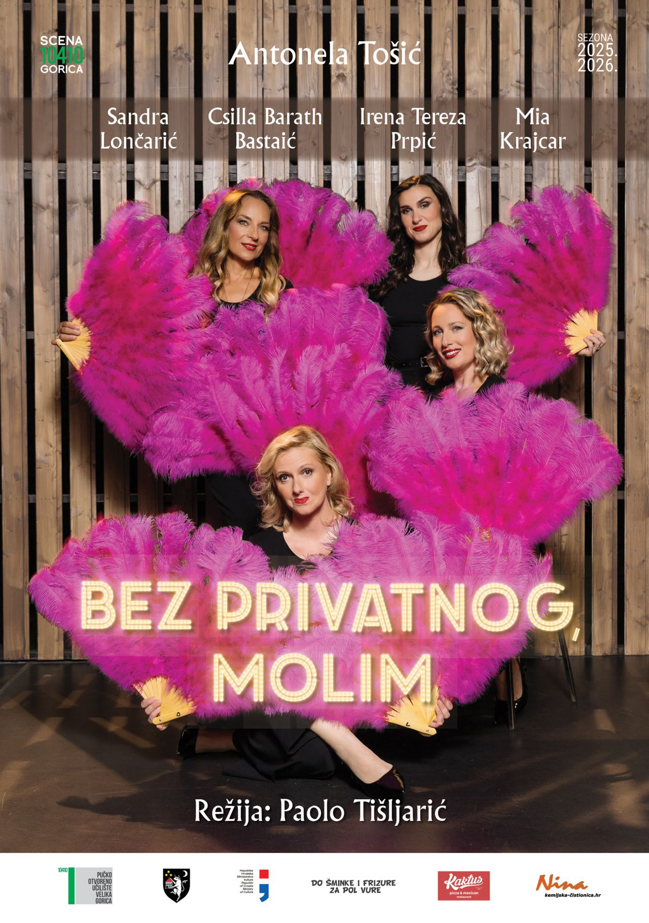 Praizvedba teksta Antonele Tošić „Bez privatnog, molim“ u režiji Paola Tišljarića donosi susret četiri žene okupljene oko čitateljskog kluba, gdje knjige postaju poticaj za razmjenu osobnih priča, ispovijesti i skrivenih emocija. Na sceni se, između redaka romana i gutljaja čaja, raspliću svakodnevne dileme, tajne i priznanja koja otkrivaju koliko je svaka od njih istodobno snažna i ranjiva. Žanrovski smještena između kriminalističke komedije i kabareta, ona kombinira britak humor, glazbene elemente i dinamičnu scensku igru. Na površini lagana i razigrana, predstava postupno otvara dublje slojeve pitanja identiteta, međuljudskih odnosa i potrebe za bliskošću. Konceptualno i idejno oslanjajući se na legendarne predstave i filmove Boba Fossea otvaramo prostor prepoznavanja i tihog razmišljanja o vlastitim ulogama i izborima.