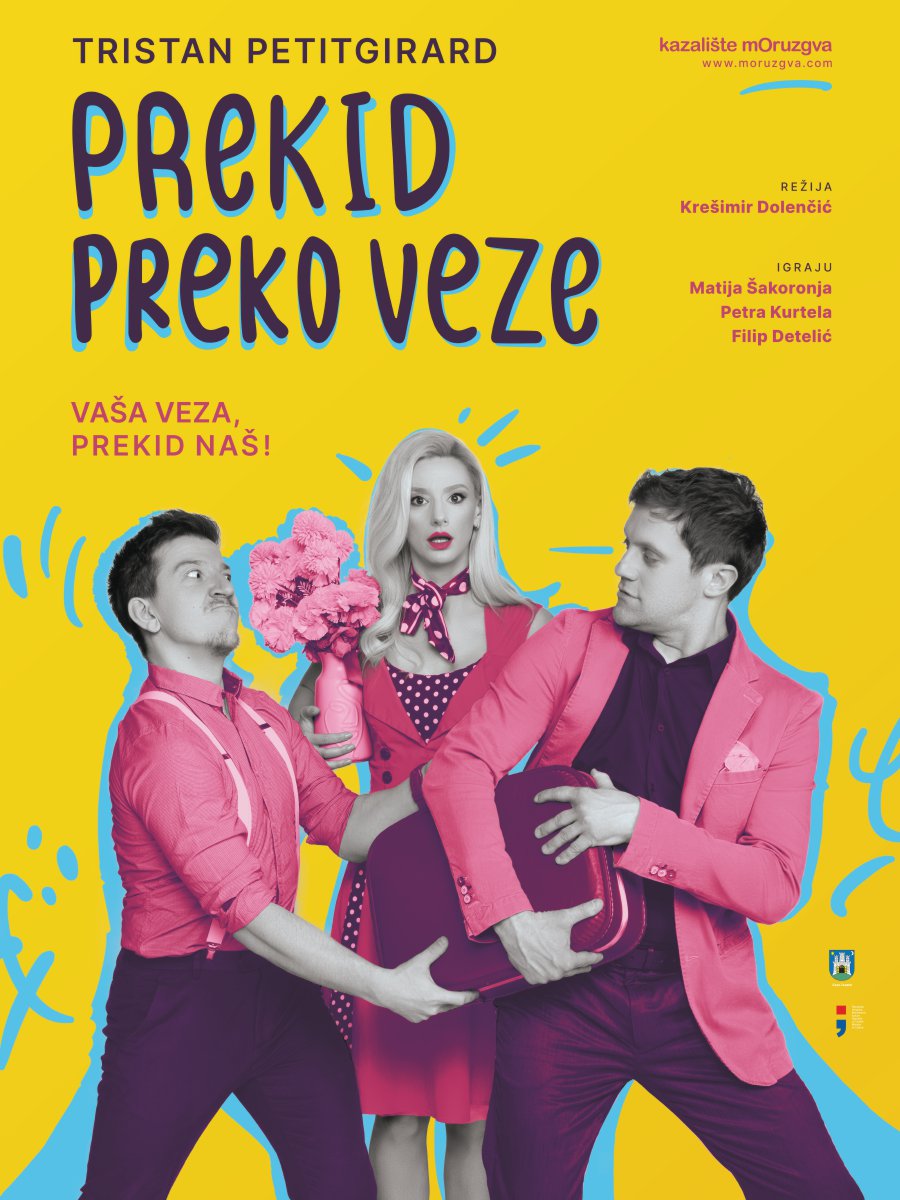 Prekid preko veze je nova komedija Kazališta Moruzgva koja prati neobičnu agenciju specijaliziranu za preuzimanje teških razgovora o prekidu veza umjesto svojih klijenata. Obećava besprijekornu uslugu ispričanu kroz dozu humora i neobičnih situacija. Autor Tristan Petitgirard donosi modernu i nepredvidivu verziju romantične komedije, obogaćenu smijehom, nesporazumima te neprestanim preokretima. Ova europska hit predstava proizašla je  iz pera renomiranog francuskog autora, redatelja i glumca Tristana Petitgirarda, dobitnika prestižne Moliereove nagrade. Predstava je postala nezaobilazna među ljubiteljima kazališta diljem Europe, a mi smo izuzetno ponosni što prvi donosimo ovu komediju na naše prostore, i to u režiji velikog hrvatskog redatelja Krešimira Dolenčića