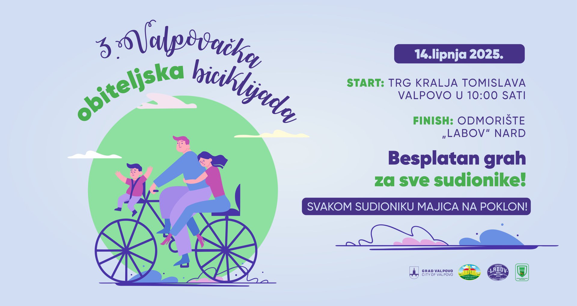 I ove godine, Grad Valpovo, Turistička zajednica Grada Valpova, Udruga „Labov“ Nard te Zajednica športskih udruga grada Valpova Vas s veseljem pozivaju na TREĆU VALPOVAČKU OBITELJSKU BICIKLIJADU koja će se održati u subotu, 14. lipnja 2025. godine s početkom u 10:00 sati.