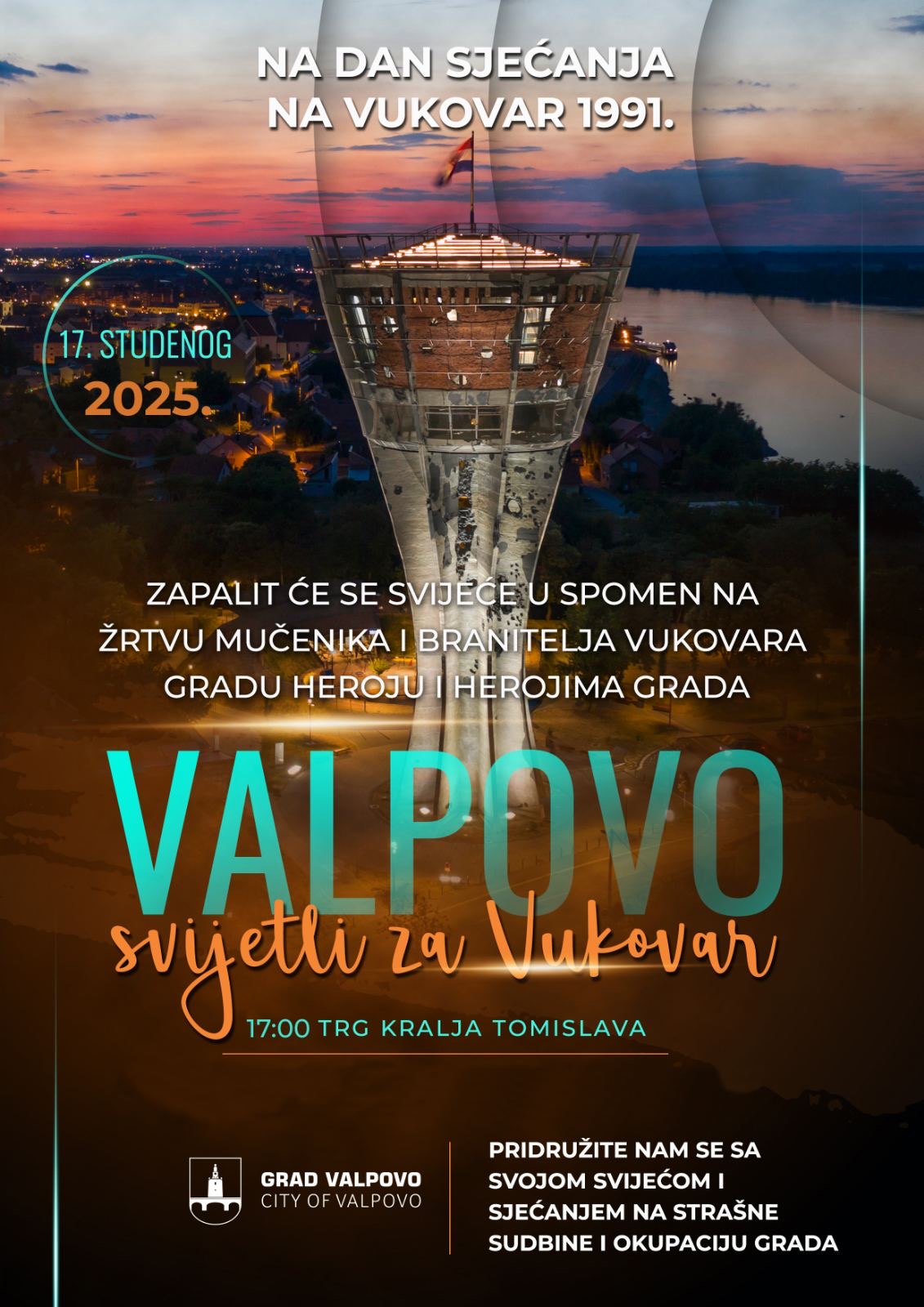Na dan sjećanja na Vukovar, 17. studenog 2025. u 17:00 na Trgu kralja Tomislava, zapalit će se svijeće u spomen na žrtvu mučenika i branitelja Vukovara gradu heroju i herojima grada.