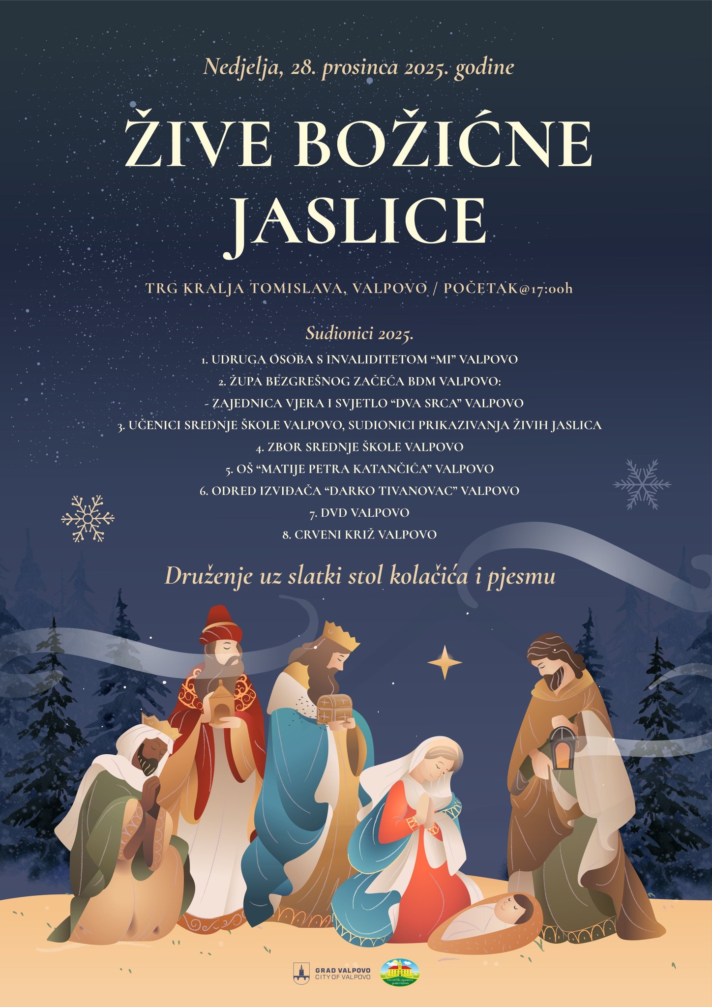 U sklopu Adventa u Valpovu 2025., Grad Valpovo, Turistička zajednica Grada Valpova te članovi Udruge osoba s invaliditetom „MI“ Valpovo s radošću pozivaju sve ljude dobre volje na uprizorenje Živih božićnih jaslica.